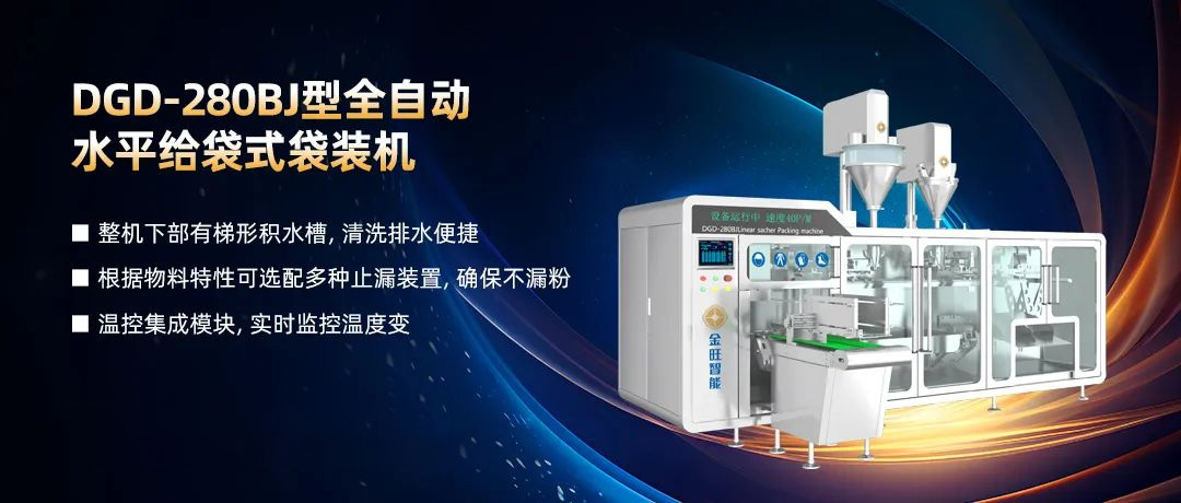 金旺智能DGD-280AJ全自動(dòng)水平給袋式袋裝機(jī)為金旺智能新研發(fā)在線稱重式袋裝機(jī)。在PLC的可編程控制下,實(shí)現(xiàn)了由取袋→開袋→檢測(cè)→充填1→預(yù)稱重→充填2→封口→成品的功能。