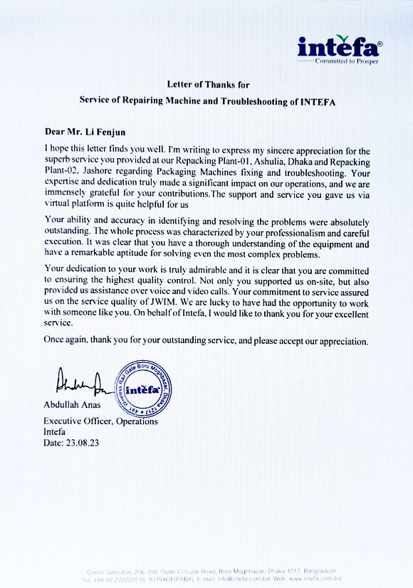 以客戶為中心,重視客戶需求,全力以赴,使命必達(dá)的高品質(zhì)服務(wù),是金旺智能一向的追求。踏至紛來的感謝信也證明了金旺智能的言行一致。