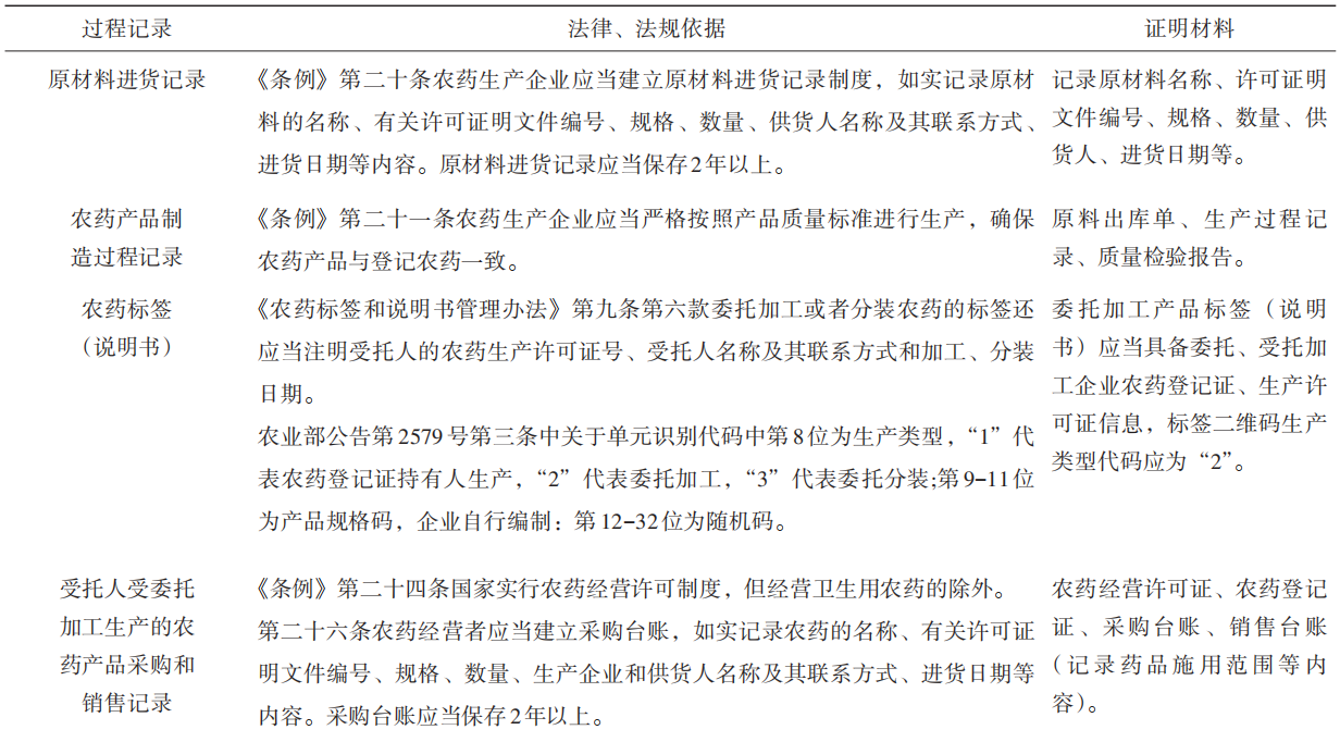 表1 農(nóng)藥委托加工過程法定記錄