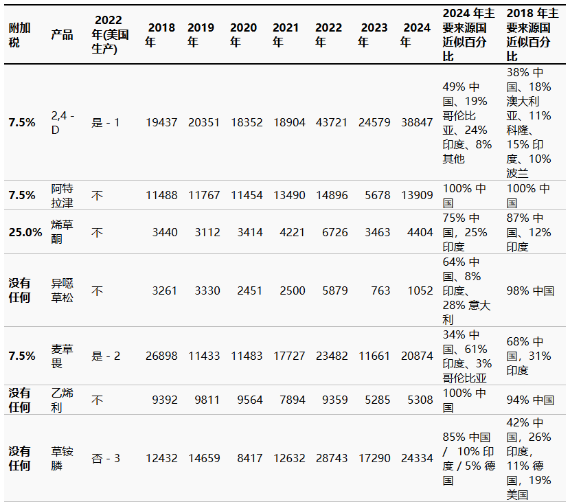 注1-在美國生產(chǎn);注2-在美國生產(chǎn),使用了一些進口元素;注3-美國于2020年中期停止生產(chǎn)草銨膦。