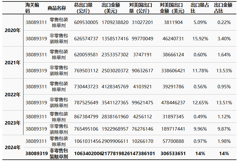 表1 中國除草劑對美國出口量占比