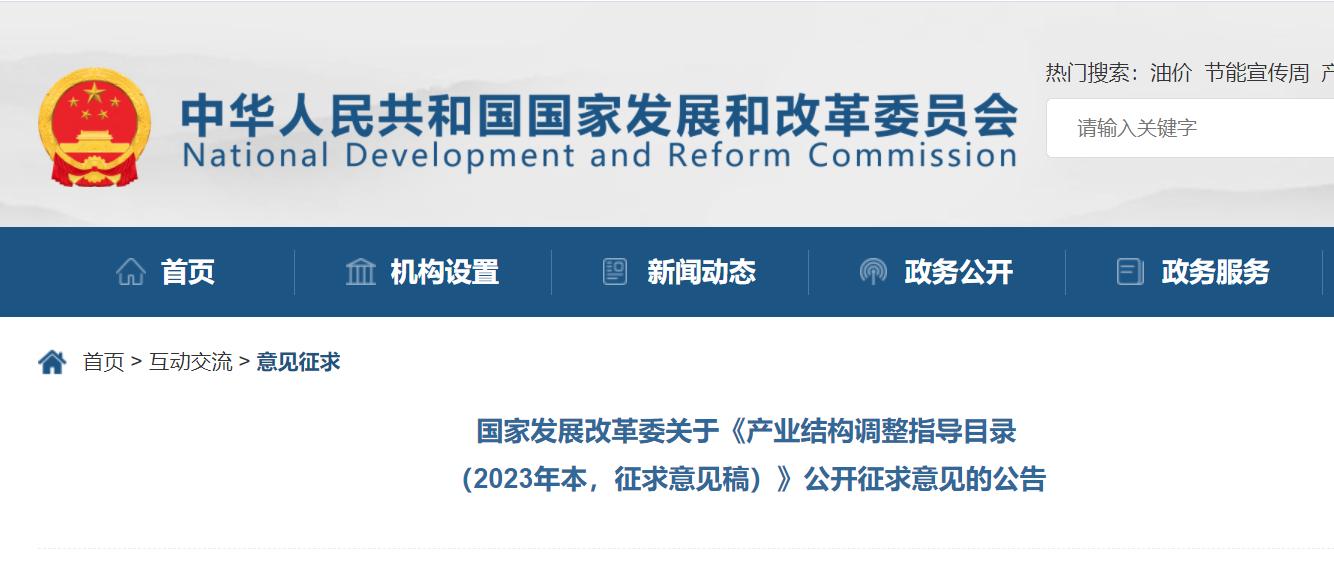 為深入貫徹黨的二十大精神,適應(yīng)產(chǎn)業(yè)發(fā)展新形勢(shì)新任務(wù)新要求,加快建設(shè)現(xiàn)代化產(chǎn)業(yè)體系,國(guó)家發(fā)展改革委會(huì)同有關(guān)部門修訂形成了《產(chǎn)業(yè)結(jié)構(gòu)調(diào)整指導(dǎo)目錄(2023年本,征求意見稿)》,現(xiàn)向社會(huì)公開征求意見。征求意見的時(shí)間為2023年7月14日至2023年8月14日。