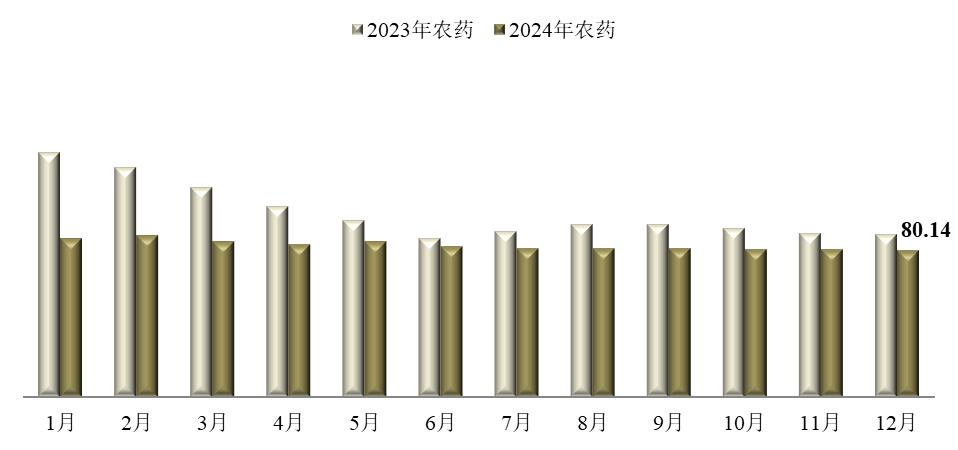 2024年12月,中國農(nóng)藥價格指數(shù)小幅回落。據(jù)中國農(nóng)藥工業(yè)協(xié)會統(tǒng)計,12月農(nóng)藥價格指數(shù)(CAPI)為80.14,環(huán)比下跌0.99%,同比下跌10.44%。整體來看,農(nóng)藥產(chǎn)品市場價格波動運行,大部分產(chǎn)品價格仍保持在低位甚至成本線運行,短期內(nèi)缺乏強勁、有效的提價因素,但部分產(chǎn)品因市場需求增加、供貨緊張等因素影響,價格回升趨勢明顯。本月,草甘膦、異丙甲草胺、毒死蜱、多菌靈等多個大宗產(chǎn)品成交價格回落,帶動價格指數(shù)整體下跌。