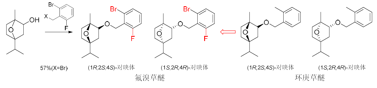 氟溴草醚是青島清原化合物公司創(chuàng)制的又一新型除草劑,可視為對(duì)環(huán)庚草醚(cinmethylin)的苯環(huán)進(jìn)行取代修飾得到。該除草劑的作用機(jī)制類同環(huán)庚草醚,為脂肪酸硫酯酶(FAT)抑制劑。室內(nèi)生測(cè)結(jié)果表明,氟溴草醚按30、60 g/hm2苗前處理對(duì)黑麥草、看麥娘、菵草和狗尾草等禾本科雜草的生長(zhǎng)抑制率≥90%(28 d),同時(shí)對(duì)花生、大豆、玉米和棉花等作物安全;按7.5 g/hm2苗后處理可完全殺死抗吡嘧磺隆的稻稗和稗草(14 d),在劑量30 g/hm2時(shí)對(duì)水稻安全。由于與當(dāng)前主流除草劑無(wú)交互抗性,氟溴草醚單用對(duì)水稻田和小麥田間抗ALS抑制劑類除草劑的鴨舌草、丁香蓼、黑麥草、看麥娘、菵草和異型莎草等禾本科雜草和莎草具有極高活性,與其他除草劑混用對(duì)甘蔗、油菜、馬鈴薯、果樹(shù)和蔬菜田間的多種禾本科和闊葉雜草也具有顯著的協(xié)同增效作用。據(jù)報(bào)道,該除草劑可用于水稻、小麥、玉米、大豆和花生及部分闊葉蔬菜作物田間雜草封閉,在水稻移栽、旱直播和水直播田間使用對(duì)稗草、稻稗、千金子和馬唐等主要禾本科雜草及部分莎草科雜草的封閉效果突出,在水田苗后早期對(duì)低齡雜草也有一定防效。氟溴草醚是(1S,2R,4R)-對(duì)映體和(1R,2S,4S)-對(duì)映體占優(yōu)勢(shì)(兩者總含量≥50%)的除草劑,且這兩種對(duì)映體的除草活性大致相當(dāng)。氟溴草醚可能的創(chuàng)制思路和合成路線見(jiàn)圖14,合成可共用環(huán)庚草醚的關(guān)鍵中間體。