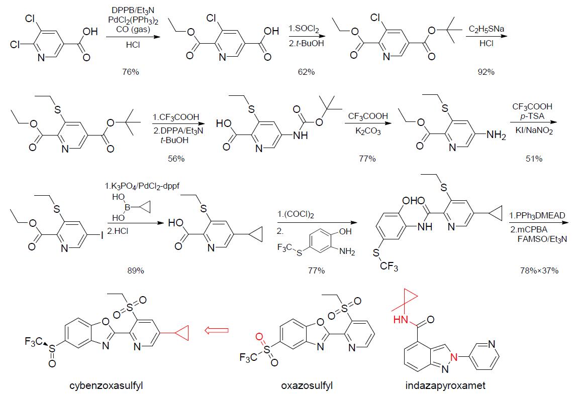 Cybenzoxasulfyl(開(kāi)發(fā)代號(hào)NNI-2101)是日本農(nóng)藥株式會(huì)社研發(fā)的含乙磺?;拎ず捅讲f唑結(jié)構(gòu)的新型殺蟲(chóng)劑,可視為對(duì)oxazosulfyl的吡啶基團(tuán)和三氟磺?;M(jìn)行修飾得到,在化學(xué)結(jié)構(gòu)上與indazapyroxamet也具有一定相似性。據(jù)報(bào)道分析,cybenzoxasulfyl具有內(nèi)吸和殺卵活性,對(duì)多種作物上的鱗翅目、半翅目和鞘翅目害蟲(chóng)均有效且對(duì)現(xiàn)有藥劑產(chǎn)生耐藥性的害蟲(chóng)防效優(yōu)異。推測(cè)cybenzoxasulfyl的作用機(jī)制類同oxazosulfyl,為狀態(tài)依賴性電壓門(mén)控鈉通道阻滯劑和囊泡乙酰膽堿轉(zhuǎn)運(yùn)蛋白(VAChT)抑制劑。室內(nèi)生測(cè)結(jié)果表明,cybenzoxasulfyl在500 mg/L劑量下,對(duì)桃蚜(6 d)、灰飛虱(8 d)和小菜蛾卵(6 d)的防效均達(dá)100%。進(jìn)一步的研究結(jié)果表明,cybenzoxasulfyl按10 mg/L噴霧處理對(duì)棉蚜和桃蚜成蟲(chóng)的防效分別為69%~96.6%(6~11 d)、66.2%(4 d),與tiadinil、氟苯蟲(chóng)酰胺(flubendiamide)、indanofan、螺蟲(chóng)乙酯(spirotetramat)和其他多種農(nóng)藥混用對(duì)稻瘟病、小菜蛾、鴨舌草、褐飛虱和蚜蟲(chóng)等防控具有協(xié)同增效作用。在公共衛(wèi)生方面的活性測(cè)試結(jié)果表明,cybenzoxasulfyl按5 mg/m2殘留暴露處理對(duì)德國(guó)小蠊若蟲(chóng)(1 d)和雌性岡比亞按蚊(4 d)和白蟻的防效均達(dá)100%,按100 mg/m2殘留暴露處理對(duì)小黃家蟻(3 d)的防效也達(dá)100%。由于注冊(cè)和盈利可預(yù)期,該產(chǎn)品正在日本、韓國(guó)和印度等國(guó)開(kāi)展應(yīng)用研究與注冊(cè)登記。Cybenzoxasulfyl以(R)-對(duì)映體為主,熔點(diǎn)58~60℃,其可能創(chuàng)制思路與合成路線見(jiàn)圖2,合成可共用oxazosulfyl的中間體。