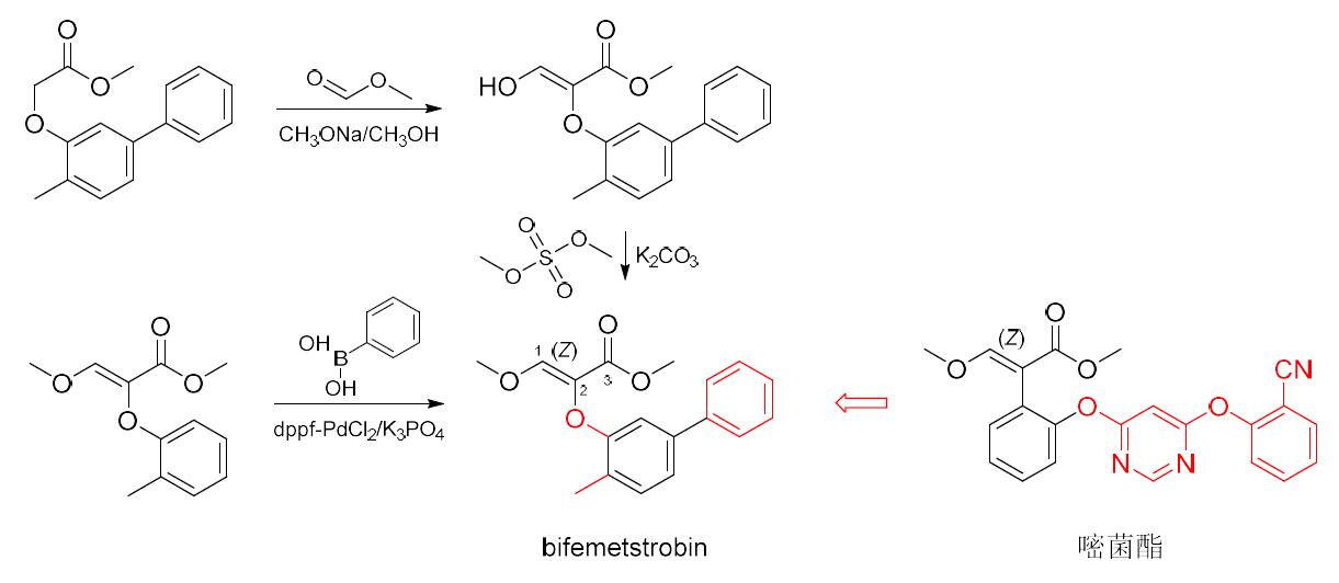 Bifemetstrobin(開(kāi)發(fā)代號(hào)S-2326)是日本住友化學(xué)株式會(huì)社開(kāi)發(fā)的新型殺菌劑,其化學(xué)結(jié)構(gòu)與嘧菌酯相似,可視為由4-甲基聯(lián)苯氧基對(duì)2-位的芳環(huán)進(jìn)行修飾得到。與其他甲氧基丙烯酸類殺菌劑不同,bifemetstrobin在甲氧基丙烯酸酯和苯環(huán)之間插入了氧原子。推測(cè)bifemetstrobin的作用機(jī)制與甲氧基丙烯酸酯類殺菌劑類同,均為呼吸鏈線粒體復(fù)合物Ⅲ細(xì)胞色素bc1(泛醇氧化酶)外側(cè)Qo位點(diǎn)(cyt b基因)抑制劑。室內(nèi)生測(cè)結(jié)果表明,bifemetstrobin在500 mg/L時(shí)對(duì)水稻稻瘟?。? d)、小麥白粉病(7 d)、銹病(7 d)、疫病(11 d)和紋枯?。?1 d),以及葡萄霜霉病(7 d)、黃瓜白粉病(12 d)的預(yù)防效果>90%。Bifemetstrobin與吡唑酰胺和吡啶酰胺類殺菌劑混用具有協(xié)同增效作用。進(jìn)一步的研究結(jié)果表明,bifemetstrobin的復(fù)配對(duì)小麥殼針孢葉枯病菌(Septoria tritici,敏感系及抗性系)、黃瓜白粉?。?/span>Sphaerotheca fuliginea)、炭疽?。?/span>Colletotrichum lagenarium,敏感系及抗性系)和霜霉?。?/span>Pseudoperonospora cubensis,敏感系及抗性系)、番茄葉霉?。?/span>Cladosporium fulvum)、大豆銹?。?/span>Phakopsora pachyrhizi,敏感系及抗性系)、灰斑?。?/span>Cercospora sojina,敏感系及抗性系)和霜霉病(Erysiphe diffusa)、小麥葉銹病(Puccinia recondita)、水稻稻瘟病(Magnaporthe grisea,敏感系及抗性系)、大麥網(wǎng)斑病(Pyrenophora teres,敏感系及抗性系)、豆角菌核?。?/span>Sclerotinia sclerotiorum)和大麥云紋病菌(Rhynchosporium secalis,敏感系及抗性系)、玉米灰斑病菌(Cercospora zeae-maydis)和馬鈴薯早疫?。?/span>Alternaria solani)等多種病害均具有較高活性。Bifemetstrobin為(Z)-式異構(gòu)體,可能創(chuàng)制思路和合成路線見(jiàn)圖7,粗品可用二甲苯、二甲苯/甲醇混合液、乙酸乙酯/正己烷混合液重結(jié)晶或硅膠柱層析精制提純。