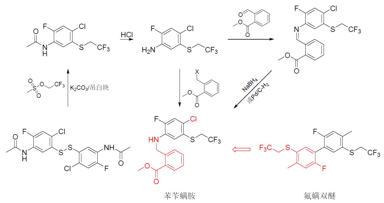 苯芐螨胺是繼氟螨雙醚(bisulflufen)后第2個(gè)獲ISO批準(zhǔn)的中國(guó)自主創(chuàng)制的三氟乙基硫醚類殺螨劑,具有獨(dú)特的化學(xué)機(jī)構(gòu),推測(cè)其作用機(jī)制與氟螨雙醚以及三氟乙基亞砜類殺螨劑sulfiflumin和flupentiofenox類同,為線粒體脂肪代謝和能量生成抑制劑。室內(nèi)生測(cè)結(jié)果表明,苯芐螨胺在6.25、3.12 mg/L時(shí)對(duì)朱砂葉螨的致死率均>90%(72 h),且在低質(zhì)量濃度時(shí)的活性優(yōu)于丁氟螨酯和聯(lián)苯肼酯。據(jù)開(kāi)發(fā)公司報(bào)道,苯芐螨胺具有胃毒和觸殺活性,以及一定的葉片滲透性,對(duì)不同生長(zhǎng)發(fā)育階段的植食性螨均有效,速效性好且持效性長(zhǎng)達(dá)25 d以上。苯芐螨胺可能創(chuàng)制思路與合成路線見(jiàn)圖1。