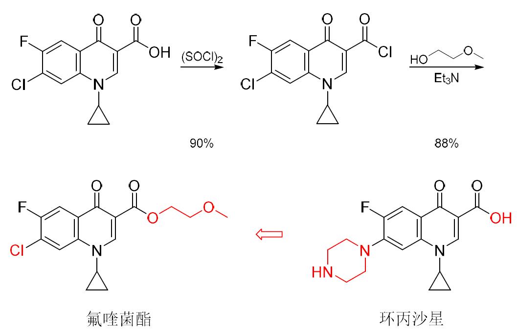 氟喹菌酯(開(kāi)發(fā)代號(hào)LH-363)是山東省聯(lián)合農(nóng)藥工業(yè)有限公司開(kāi)發(fā)的又一新型殺菌劑。從化學(xué)結(jié)構(gòu)上看,氟喹菌酯與環(huán)丙沙星(ciprofloxacin)和噁喹酸(oxilinic acid)等喹諾酮類抗菌藥物具有較高的相似性,可視為由環(huán)丙沙星進(jìn)行苯環(huán)上的取代基替換和羧基酯化保護(hù)得到。推測(cè)其作用機(jī)制與喹諾酮類抗菌藥物類同,為靶向細(xì)菌的DNA促旋酶(DNA gyrase)和拓?fù)洚悩?gòu)酶Ⅳ(topoisomerase Ⅳ)抑制劑。室內(nèi)生測(cè)結(jié)果表明,氟喹菌酯對(duì)黃瓜細(xì)菌性角斑病、煙草青枯病、馬鈴薯黑脛病、甘薯莖腐病、水稻白葉枯病、西瓜果斑病、大白菜黑腐病和軟腐病、木薯細(xì)菌性枯萎病、梨火疫病等細(xì)菌性病害的離體抑菌活性(1 mg/L)和活體保護(hù)效果(5 mg/L)均>90%,都顯著優(yōu)于喹啉銅和中生菌素;在200 mg/L時(shí)對(duì)作物安全且可促進(jìn)作物生長(zhǎng)發(fā)育(生長(zhǎng)速率、葉綠素和葉面積都增加)。氟喹菌酯可能創(chuàng)制思路和合成路線見(jiàn)圖10,其合成可以環(huán)丙沙星的關(guān)鍵中間體為起始原料。